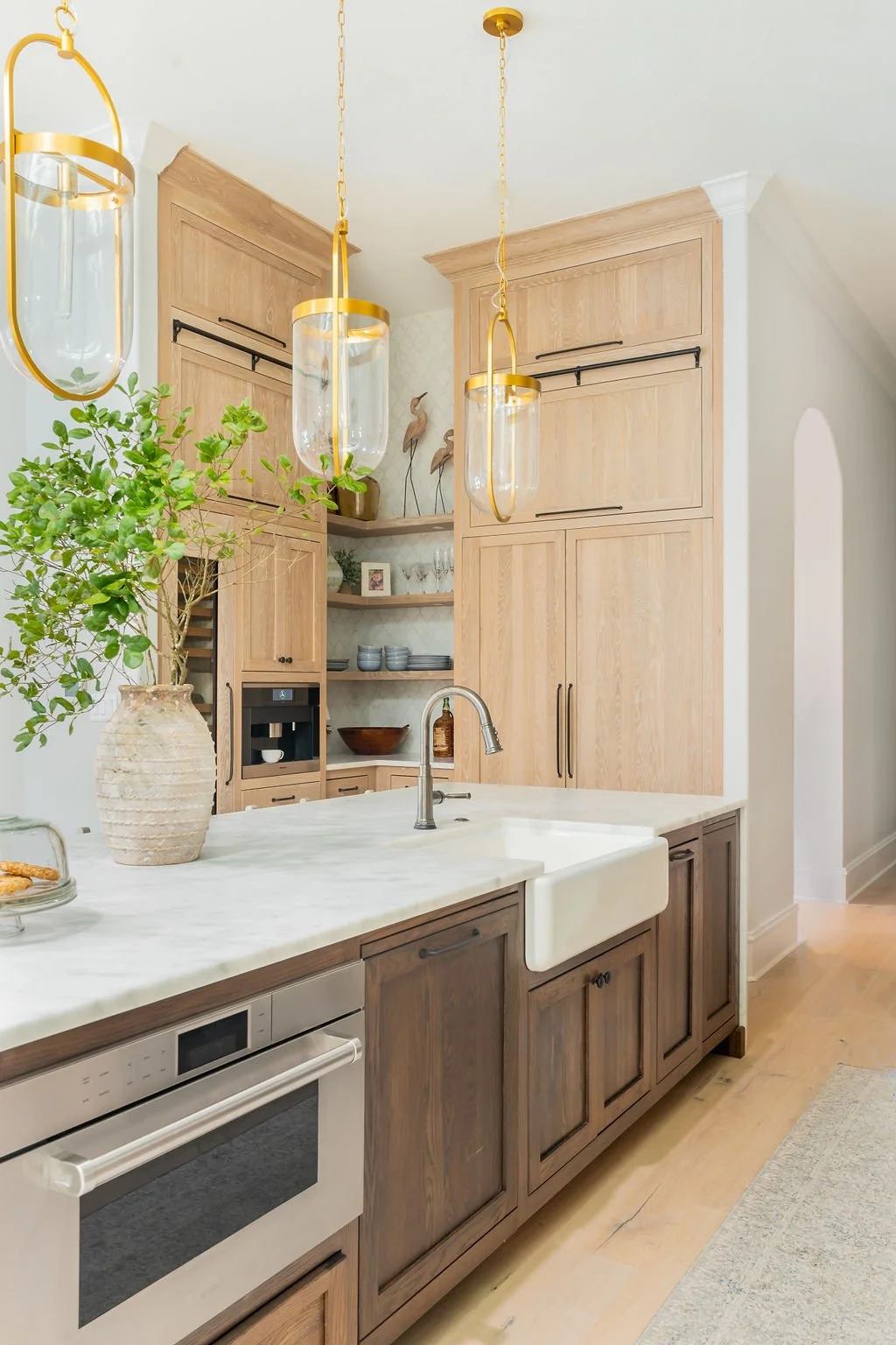 This home has some of my favorite before and after photos. We demolished the kitchen and dining room and created a much more functional and fabulous kitchen. We loved our custom wine wall with the unique cork wallpaper and dramatic lighting in this one-of-a-kind dining room.